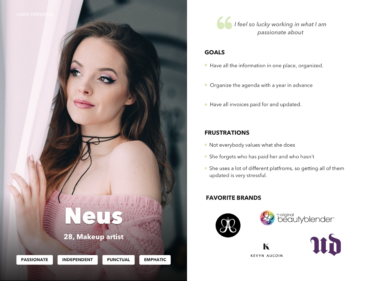 Neus, my user persona, embodies all the information I obtained in the research and helps me to focus the platform on the users needs.